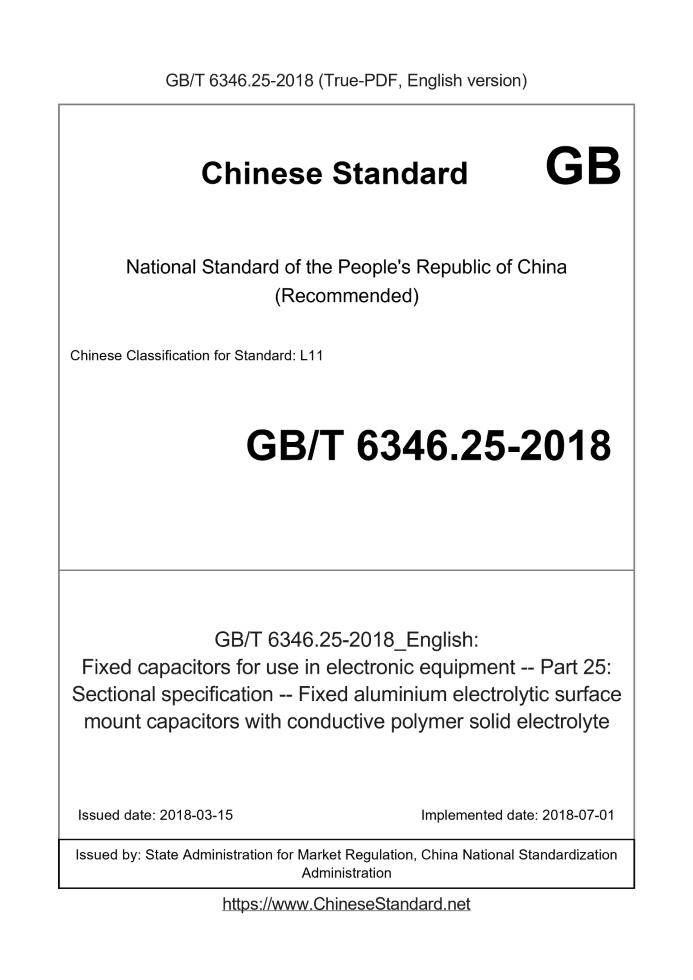 Delivery: <= 5 days. True-PDF full-copy in English will be manually translated and delivered via email. GB/T 6346.25-2018: Fixed capacitors for use in electronic equipment -- Part 25: Sectional specification -- Fixed aluminium electrolytic surface mount capacitors with conductive polymer solid electrolyte Status: Valid