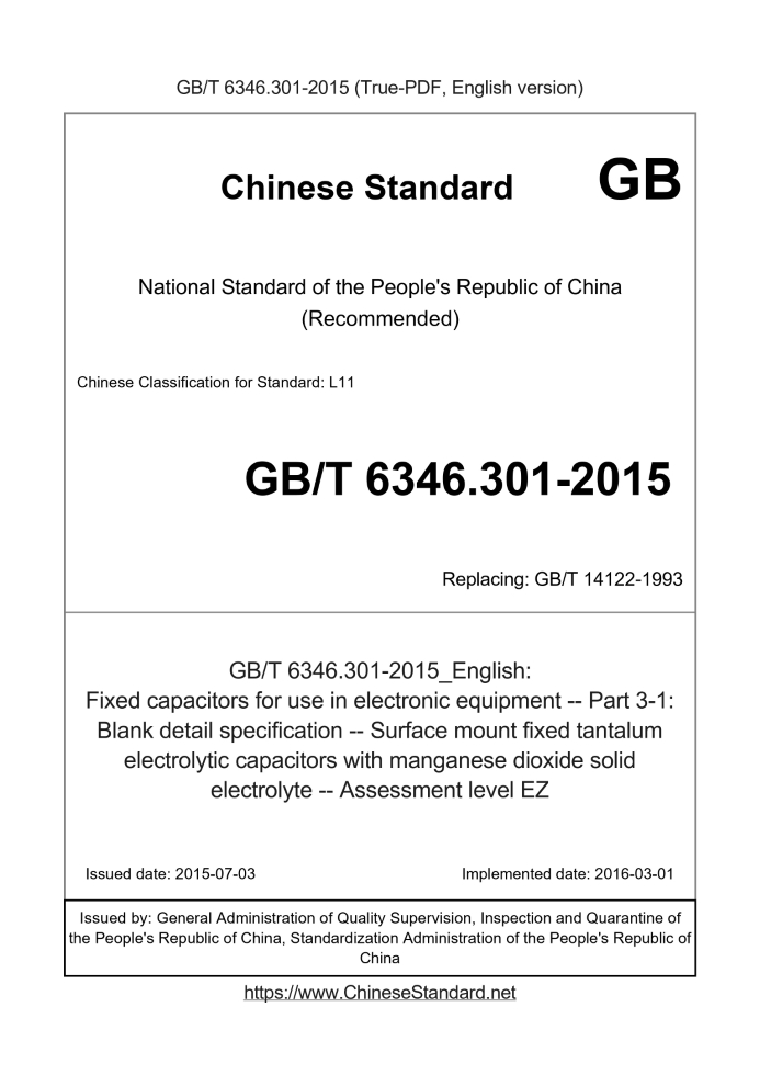 GB/T 6346.301-2015: Fixed capacitors for use in electronic equipment -- Part 3-1: Blank detail specification -- Surface mount fixed tantalum electrolytic capacitors with manganese dioxide solid electrolyte -- Assessment level EZ