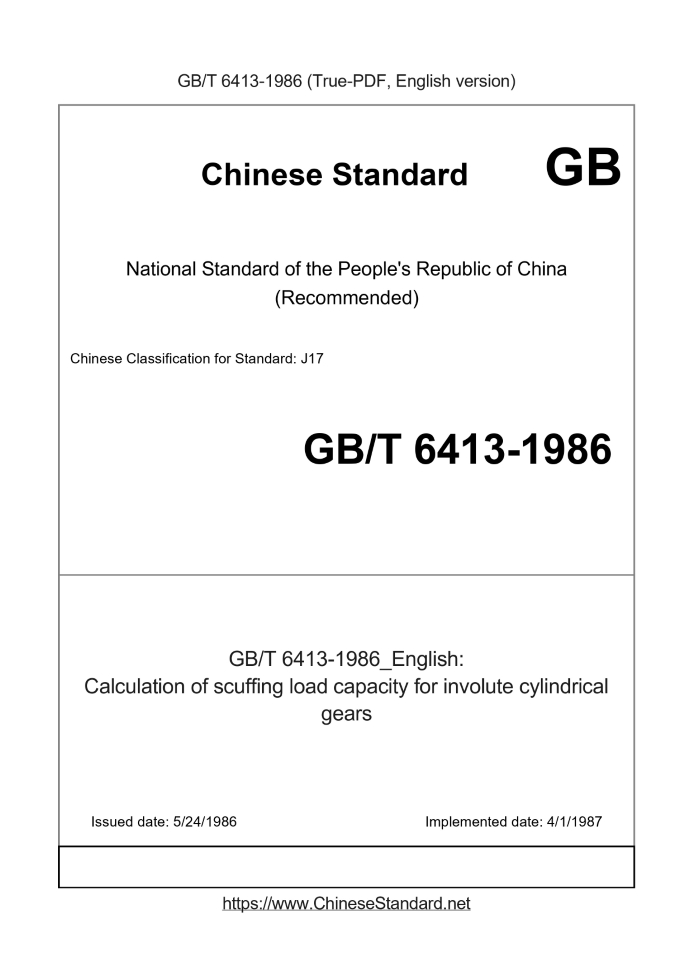 GB/T 6413-1986: Calculation of scuffing load capacity for involute cylindrical gears