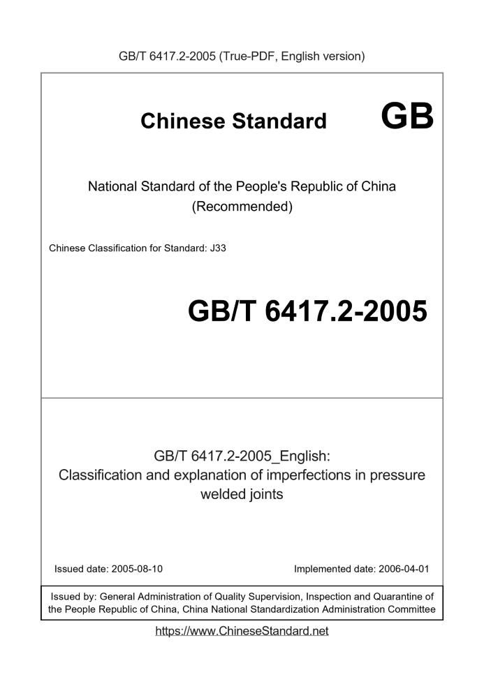 Delivery: <= 3 days. True-PDF full-copy in English will be manually translated and delivered via email. GB/T 6417.2-2005: Classification and explanation of imperfections in pressure welded joints Status: Valid