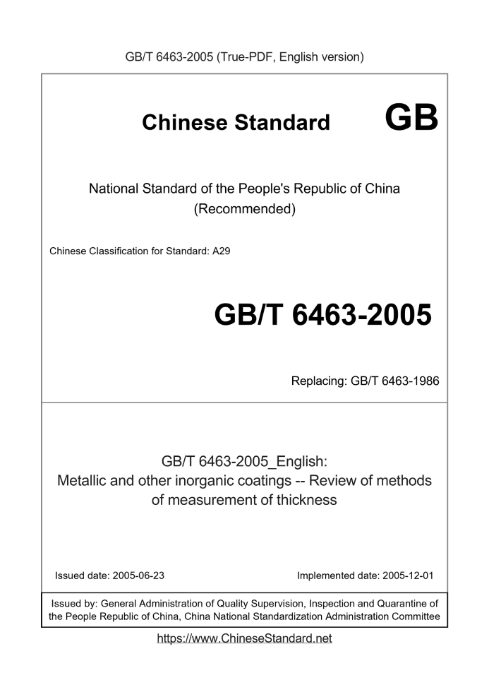 Delivery: <= 3 days. True-PDF full-copy in English will be manually translated and delivered via email. GB/T 6463-2005: Metallic and other inorganic coatings -- Review of methods of measurement of thickness Status: Valid GB/T 6463: Historical versions