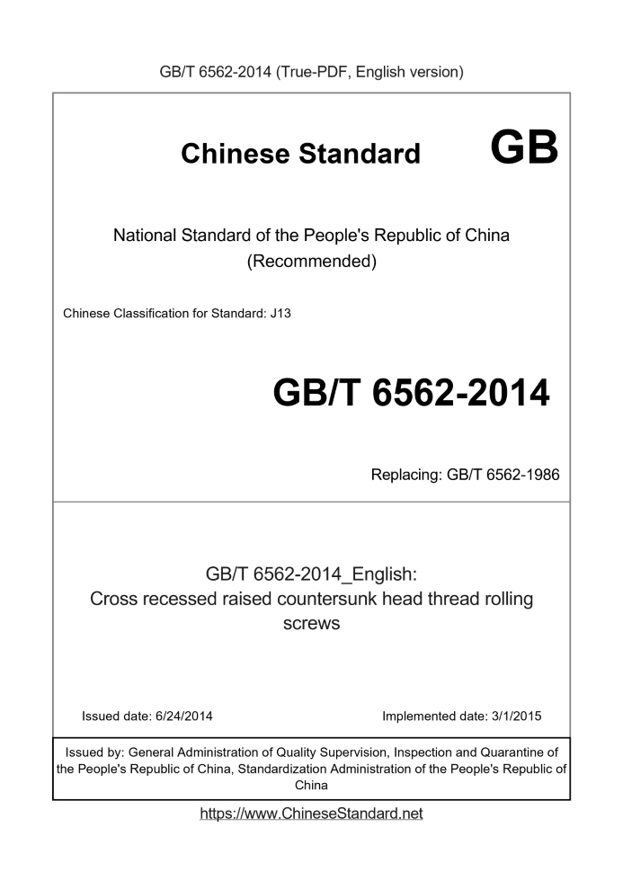 Delivery: <= 3 days. True-PDF full-copy in English will be manually translated and delivered via email. GB/T 6562-2014: Cross recessed raised countersunk head thread rolling screws Status: Valid GB/T 6562: Historical versions