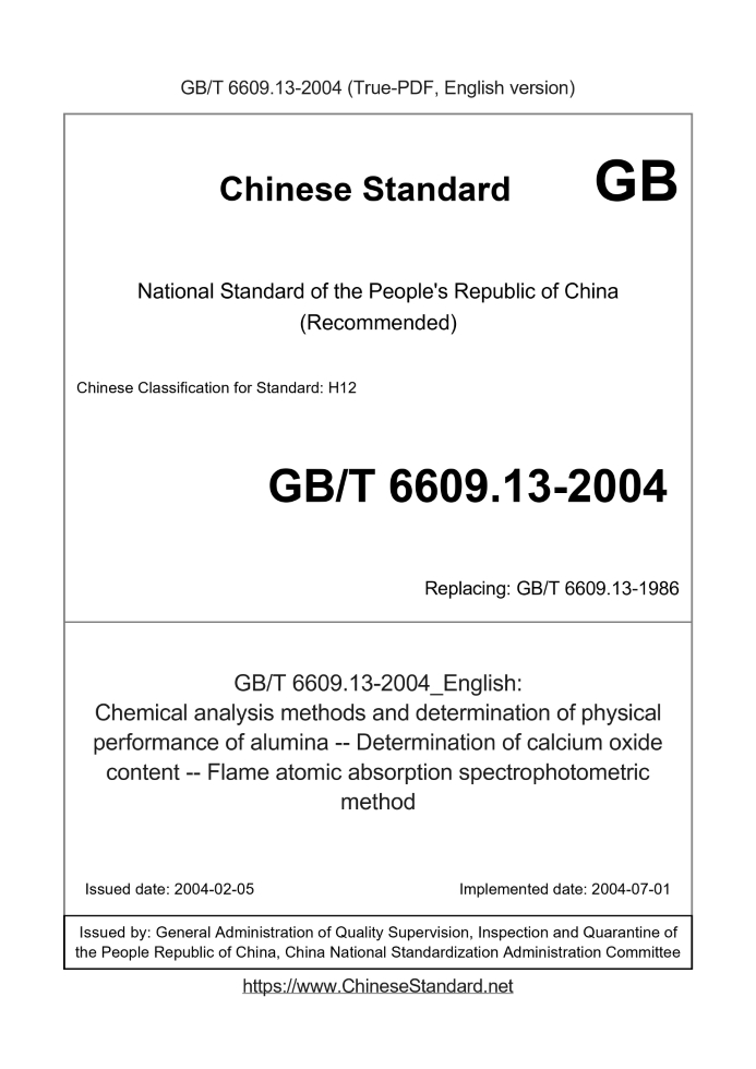 GB/T 6609.13-2004139 Add to Cart 2 days Chemical analysis methods and determination of physical performance of alumina -- Determination of calcium oxide content -- Flame atomic absorption spectrophotometric method Valid