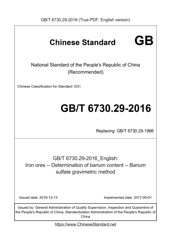 Delivery: <= 3 days. True-PDF full-copy in English will be manually translated and delivered via email. GB/T 6730.29-2016: Iron ores -- Determination of barium content -- Barium sulfate gravimetric method Status: Valid GB/T 6730.29: Historical versions