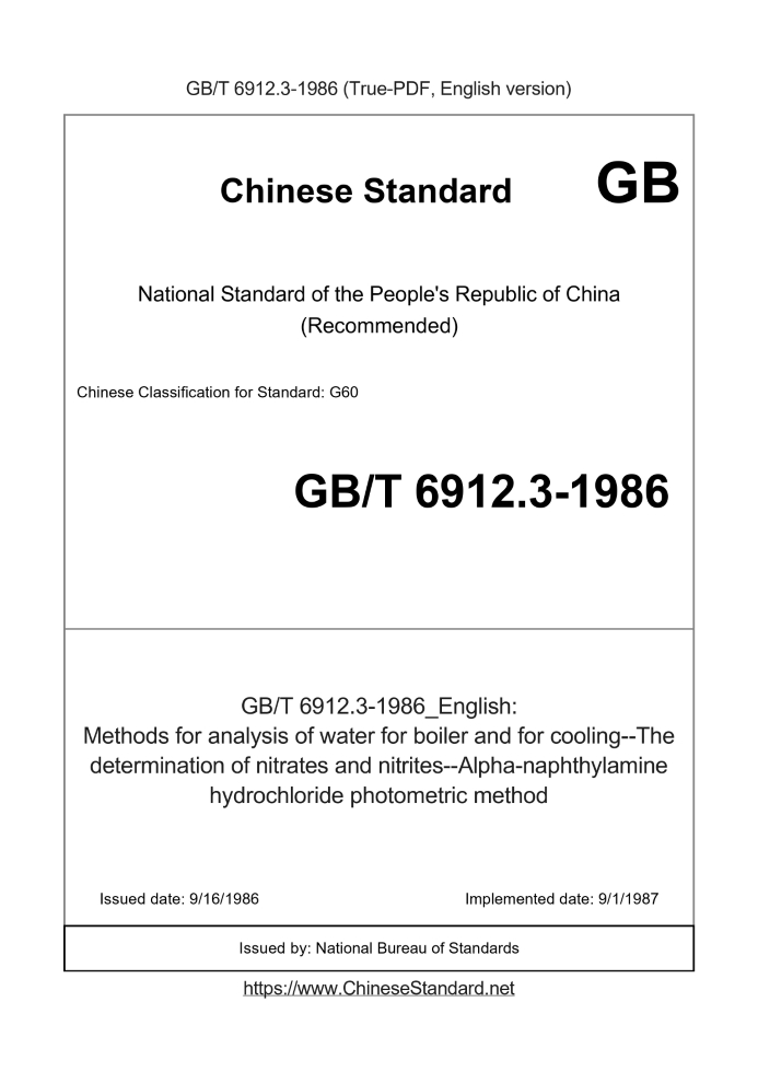 Delivery: <= 2 days. True-PDF full-copy in English will be manually translated and delivered via email. GB/T 6912.3-1986: Methods for analysis of water for boiler and for cooling--The determination of nitrates and nitrites--Alpha-naphthylamine hydrochloride photometric method Status: Obsolete