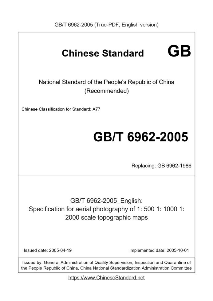 Delivery: <= 4 days. True-PDF full-copy in English will be manually translated and delivered via email. GB/T 6962-2005: Specification for aerial photography of 1: 500 1: 1000 1: 2000 scale topographic maps Status: Obsolete GB/T 6962: Historical versions