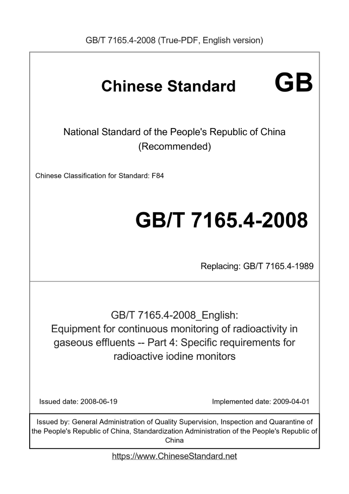 Delivery: <= 3 days. True-PDF full-copy in English will be manually translated and delivered via email. GB/T 7165.4-2008: Equipment for continuous monitoring of radioactivity in gaseous effluents -- Part 4: Specific requirements for radioactive iodine monitors Status: Valid GB/T 7165.4: Historical versions
