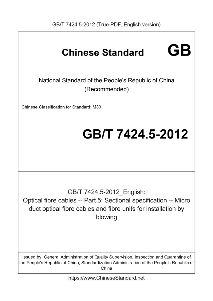 Delivery: <= 3 days. True-PDF full-copy in English will be manually translated and delivered via email. GB/T 7424.5-2012: Optical fibre cables -- Part 5: Sectional specification -- Micro duct optical fibre cables and fibre units for installation by blowing Status: Valid