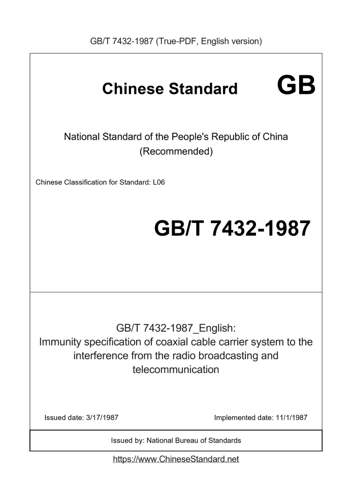 Delivery: <= 2 days. True-PDF full-copy in English will be manually translated and delivered via email. GB/T 7432-1987: Immunity specification of coaxial cable carrier system to the interference from the radio broadcasting and telecommunication Status: Obsolete