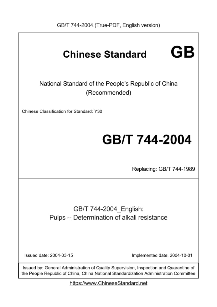GB/T 744-2004189 Add to Cart 3 days Pulps -- Determination of alkali resistance Valid
