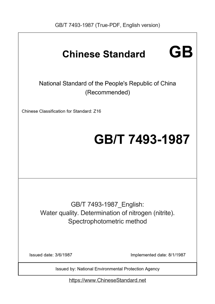 Delivery: <= 3 days. True-PDF full-copy in English will be manually translated and delivered via email. GB/T 7493-1987: Water quality. Determination of nitrogen (nitrite). Spectrophotometric method