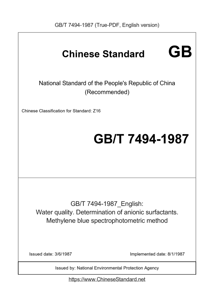 Delivery: <= 3 days. True-PDF full-copy in English will be manually translated and delivered via email. GB/T 7494-1987: Water quality. Determination of anionic surfactants. Methylene blue spectrophotometric method