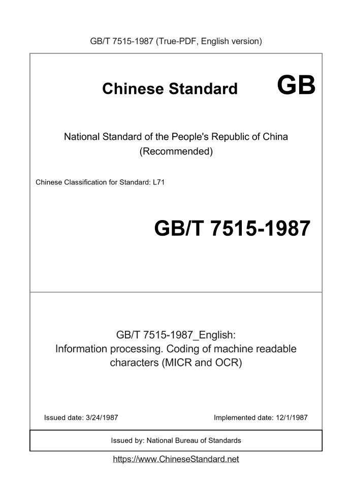 Delivery: <= 3 days. True-PDF full-copy in English will be manually translated and delivered via email. GB/T 7515-1987: Information processing. Coding of machine readable characters (MICR and OCR)
