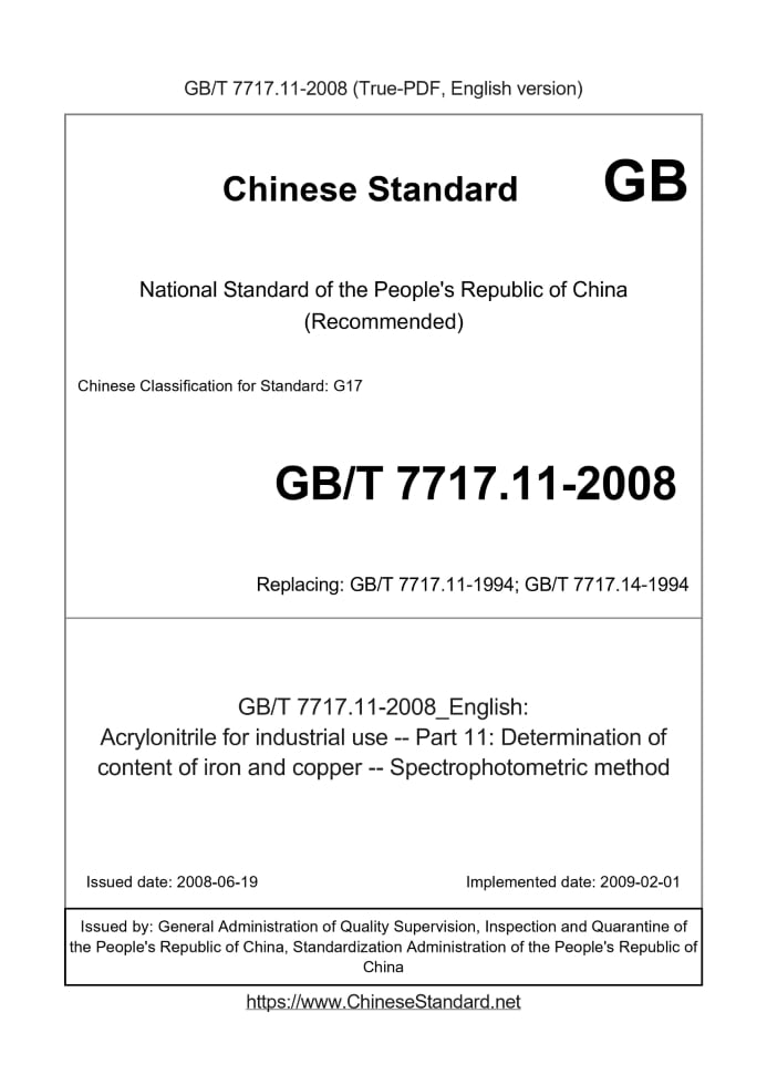 Delivery: <= 3 days. True-PDF full-copy in English will be manually translated and delivered via email. GB/T 7717.11-2008: Acrylonitrile for industrial use -- Part 11: Determination of content of iron and copper -- Spectrophotometric method Status: Valid GB/T 7717.11: Historical versions