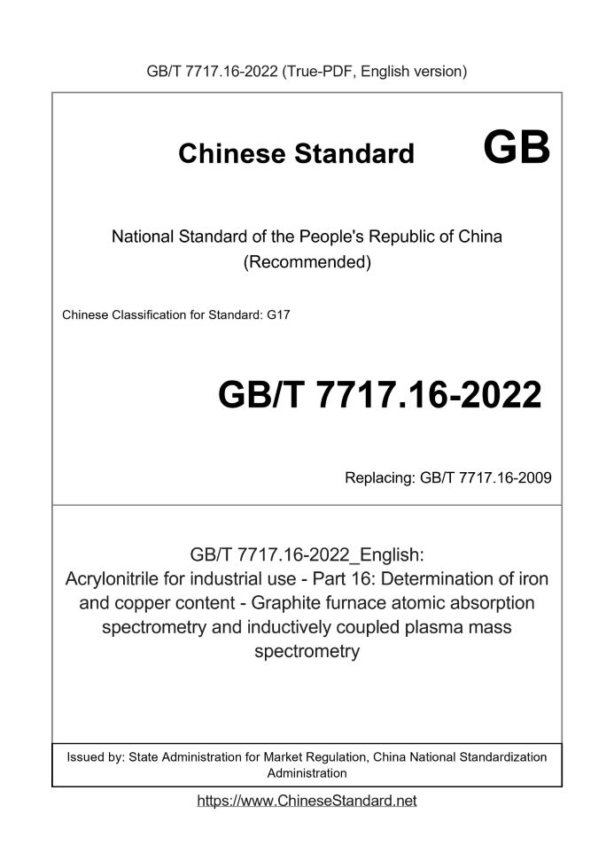 Delivery: <= 3 days. True-PDF full-copy in English will be manually translated and delivered via email. GB/T 7717.16-2022: Acrylonitrile for industrial use - Part 16: Determination of iron and copper content - Graphite furnace atomic absorption spectrometry and inductively coupled plasma mass spectrometry Status: Valid GB/T 7717.16: Historical versions