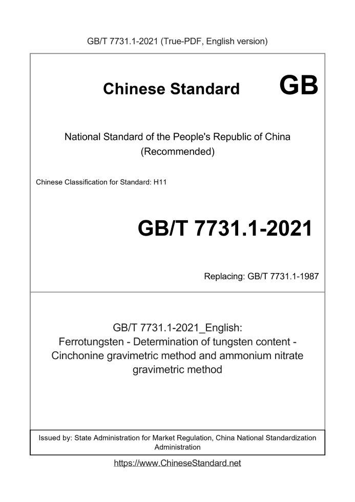 Ferrotungsten - Determination of tungsten content - Cinchonine gravimetric method and ammonium nitrate gravimetric method ICS 77.100 CCSH11 National Standards of People's Republic of China Replace GB/T 7731.1-1987 Determination of tungsten iron tungsten content Cinchonine gravimetric method and ammonium nitrate gravimetric method Released on 2021-08-20 2022-03-01 implementation State Administration of Market Supervision and Administration Issued by the National Standardization Management Committee