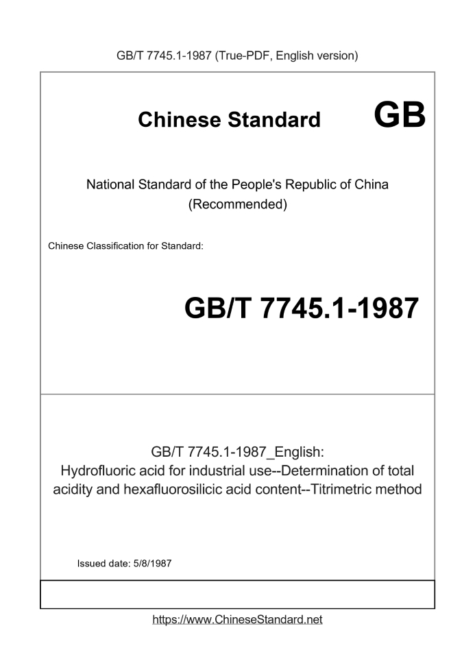Basic dataStandard ID: GB/T 7745.1-1987 (GB/T7745.1-1987)Description (Translated English): Hydrofluoric acid for industrial use--Determination of total acidity and hexafluorosilicic acid content--Titrimetric method Sector / Industry: National Standard (Recommended) Date of Issue: 5/8/1987 Tips & Frequently Asked Questions:Question 1: How long will the true-PDF of GB/T 7745.1-1987_English be delivered?Answer: Upon your order, we will start to translate GB/T 7745.1-1987_English as soon as possible, and keep you informed of the progress. The lead time is typically 1 ~ 3 working days. The lengthier the document the longer the lead time.Question 2: Can I share the purchased PDF of GB/T 7745.1-1987_English with my colleagues?Answer: Yes. The purchased PDF of GB/T 7745.1-1987_English will be deemed to be sold to your employer/organization who actually pays for it, including your colleagues and your employer's intranet.Question 3: Does the price include tax/VAT?Answer: Yes. Our tax invoice, downloaded/delivered in 9 seconds, includes all tax/VAT and complies with 100+ countries' tax regulations (tax exempted in 100+ countries) -- See Avoidance of Double Taxation Agreements (DTAs): List of DTAs signed between Singapore and 100+ countriesQuestion 4: Do you accept my currency other than USD?Answer: Yes. If you need your currency to be printed on the invoice, please write an email to Sales@ChineseStandard.net. In 2 working-hours, we will create a special link for you to pay in any currencies. Otherwise, follow the normal steps: Add to Cart -- Checkout -- Select your currency to pay. |