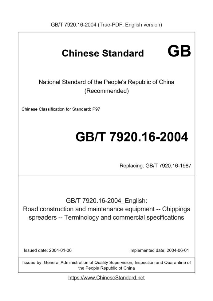 Delivery: <= 3 days. True-PDF full-copy in English will be manually translated and delivered via email. GB/T 7920.16-2004: Road construction and maintenance equipment -- Chippings spreaders -- Terminology and commercial specifications Status: Valid GB/T 7920.16: Historical versions