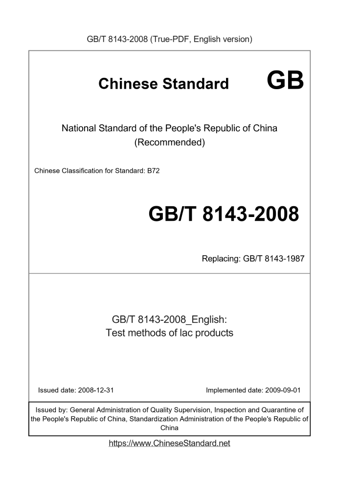 Delivery: <= 4 days. True-PDF full-copy in English will be manually translated and delivered via email. GB/T 8143-2008: Test methods of lac products Status: Valid GB/T 8143: Historical versions