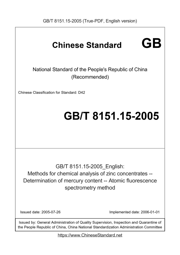 Delivery: <= 3 days. True-PDF full-copy in English will be manually translated and delivered via email. GB/T 8151.15-2005: Methods for chemical analysis of zinc concentrates -- Determination of mercury content -- Atomic fluorescence spectrometry method Status: Valid
