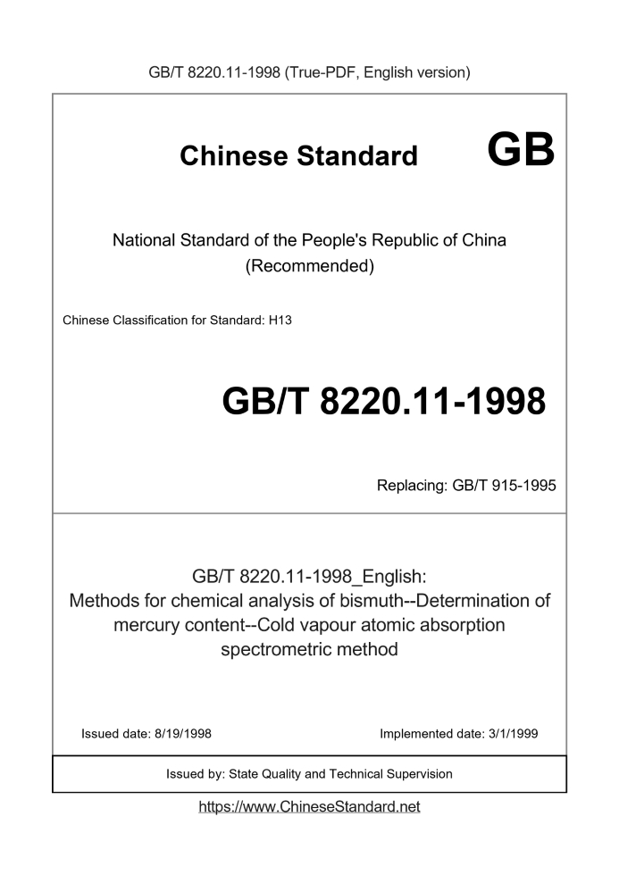 Delivery: <= 2 days. True-PDF full-copy in English will be manually translated and delivered via email. GB/T 8220.11-1998: Methods for chemical analysis of bismuth--Determination of mercury content--Cold vapour atomic absorption spectrometric method Status: Obsolete