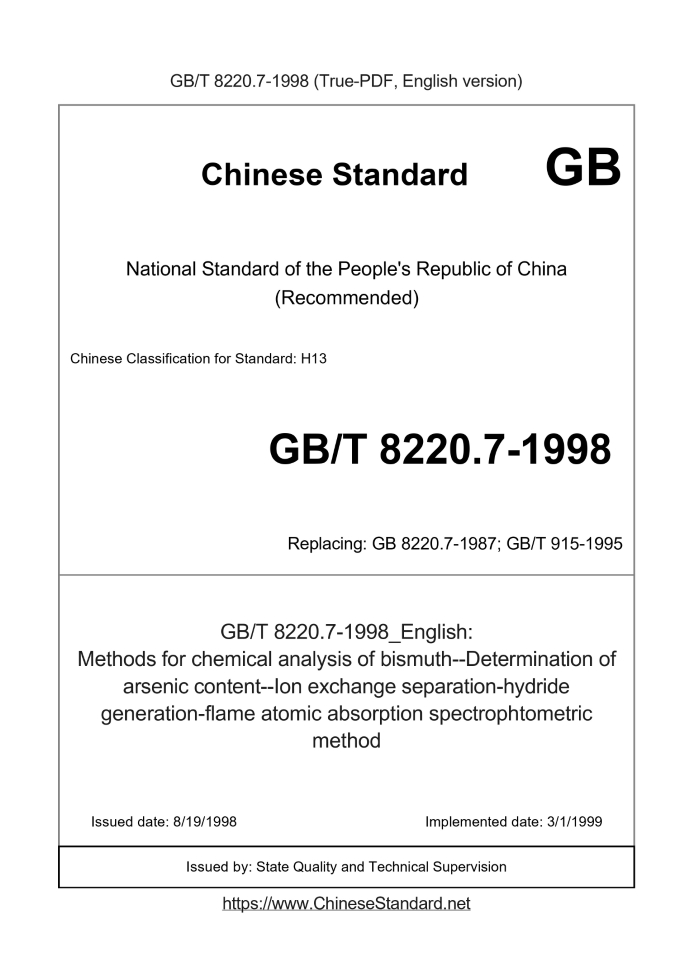 Delivery: <= 3 days. True-PDF full-copy in English will be manually translated and delivered via email. GB/T 8220.7-1998: Methods for chemical analysis of bismuth--Determination of arsenic content--Ion exchange separation-hydride generation-flame atomic absorption spectrophtometric method Status: Obsolete GB/T 8220.7: Historical versions