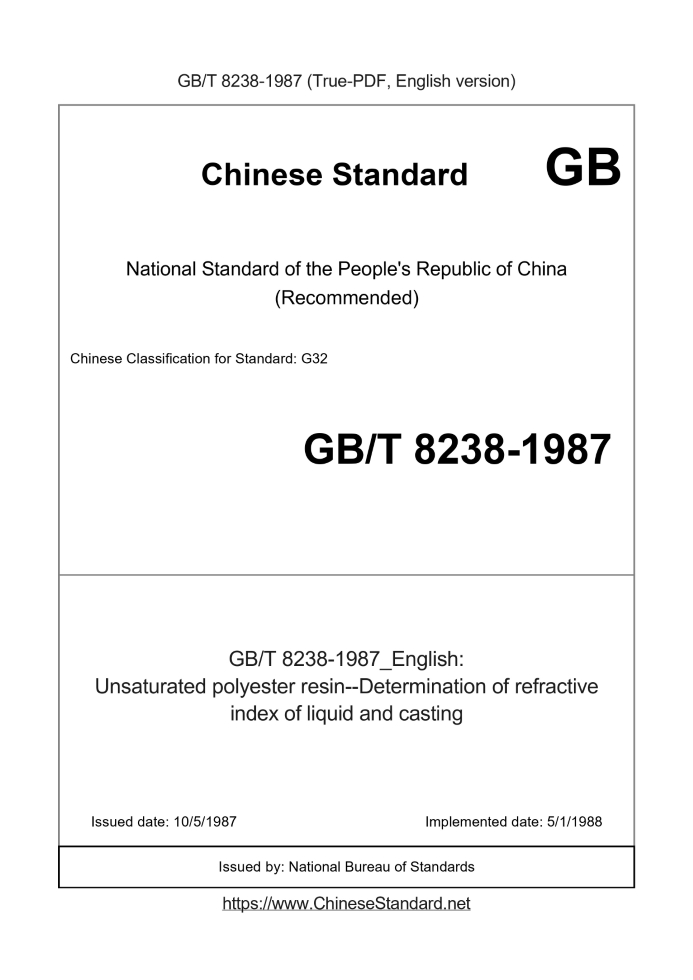 Delivery: <= 2 days. True-PDF full-copy in English will be manually translated and delivered via email. GB/T 8238-1987: Unsaturated polyester resin--Determination of refractive index of liquid and casting Status: Obsolete
