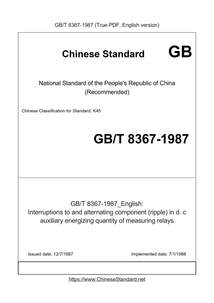 Delivery: <= 3 days. True-PDF full-copy in English will be manually translated and delivered via email. GB/T 8367-1987: Interruptions to and alternating component (ripple) in d. c auxiliary energizing quantity of measuring relays Status: Obsolete