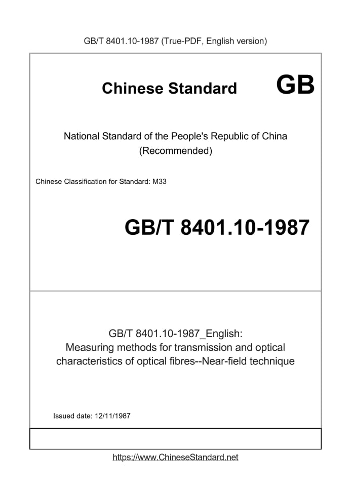 Delivery: <= 2 days. True-PDF full-copy in English will be manually translated and delivered via email. GB/T 8401.10-1987: Measuring methods for transmission and optical characteristics of optical fibres--Near-field technique Status: Obsolete