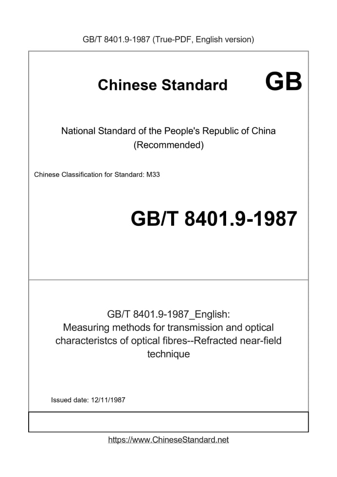 Delivery: <= 2 days. True-PDF full-copy in English will be manually translated and delivered via email. GB/T 8401.9-1987: Measuring methods for transmission and optical characteristcs of optical fibres--Refracted near-field technique Status: Obsolete