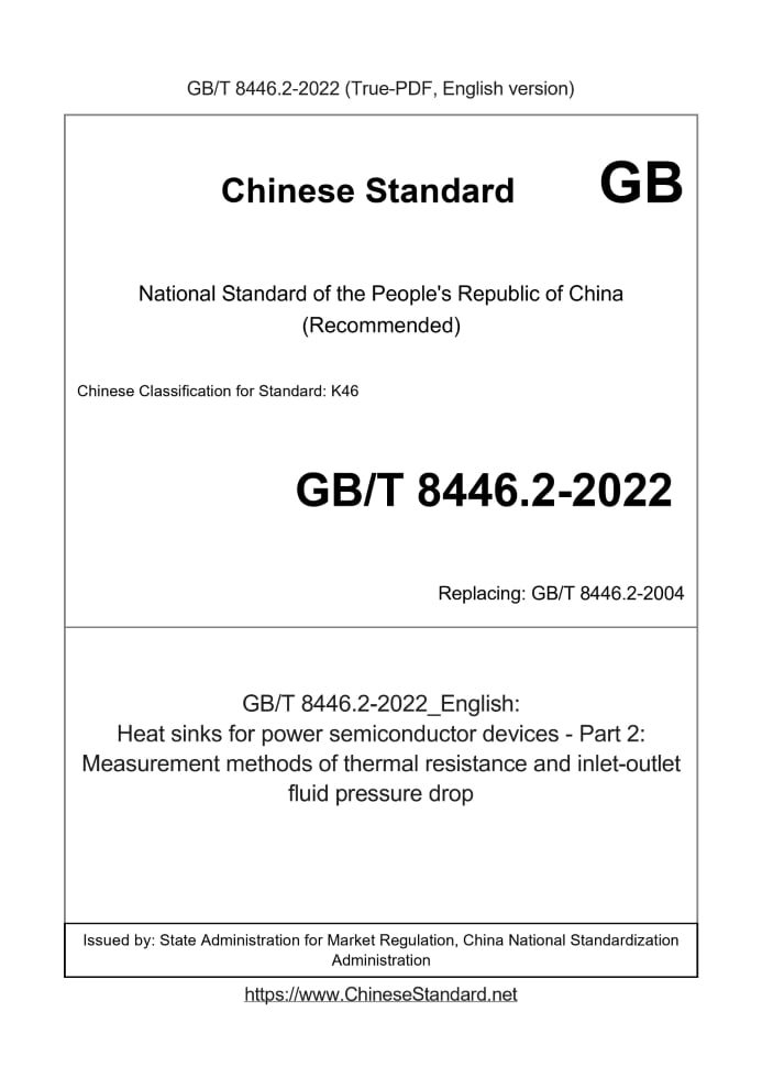 Delivery: <= 4 days. True-PDF full-copy in English will be manually translated and delivered via email. GB/T 8446.2-2022: Heat sinks for power semiconductor devices - Part 2: Measurement methods of thermal resistance and inlet-outlet fluid pressure drop Status: Valid GB/T 8446.2: Historical versions