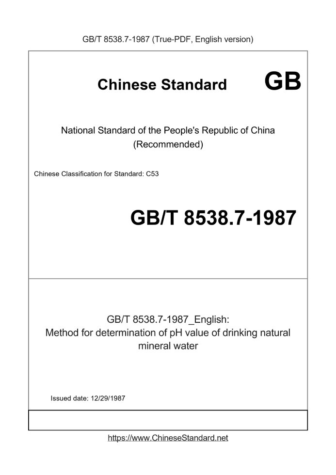 Basic dataStandard ID: GB/T 8538.7-1987 (GB/T8538.7-1987)Description (Translated English): Method for determination of pH value of drinking natural mineral water Sector / Industry: National Standard (Recommended) Date of Issue: 12/29/1987 |