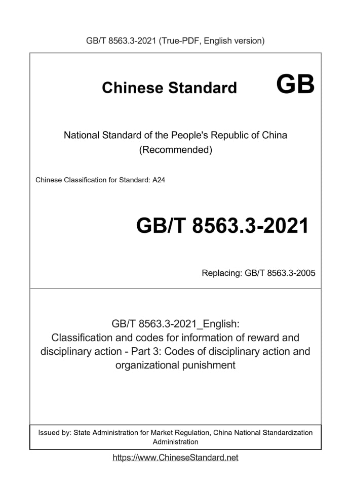 Delivery: <= 3 days. True-PDF full-copy in English will be manually translated and delivered via email. GB/T 8563.3-2021: Classification and codes for information of reward and disciplinary action - Part 3: Codes of disciplinary action and organizational punishment Status: Valid GB/T 8563.3: Historical versions