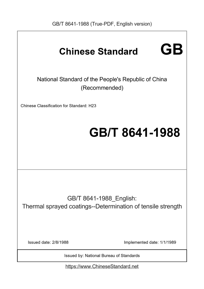 Delivery: <= 2 days. True-PDF full-copy in English will be manually translated and delivered via email. GB/T 8641-1988: Thermal sprayed coatings--Determination of tensile strength Status: Obsolete