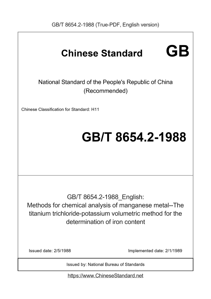 Delivery: <= 2 days. True-PDF full-copy in English will be manually translated and delivered via email. GB/T 8654.2-1988: Methods for chemical analysis of manganese metal--The titanium trichloride-potassium volumetric method for the determination of iron content Status: Obsolete