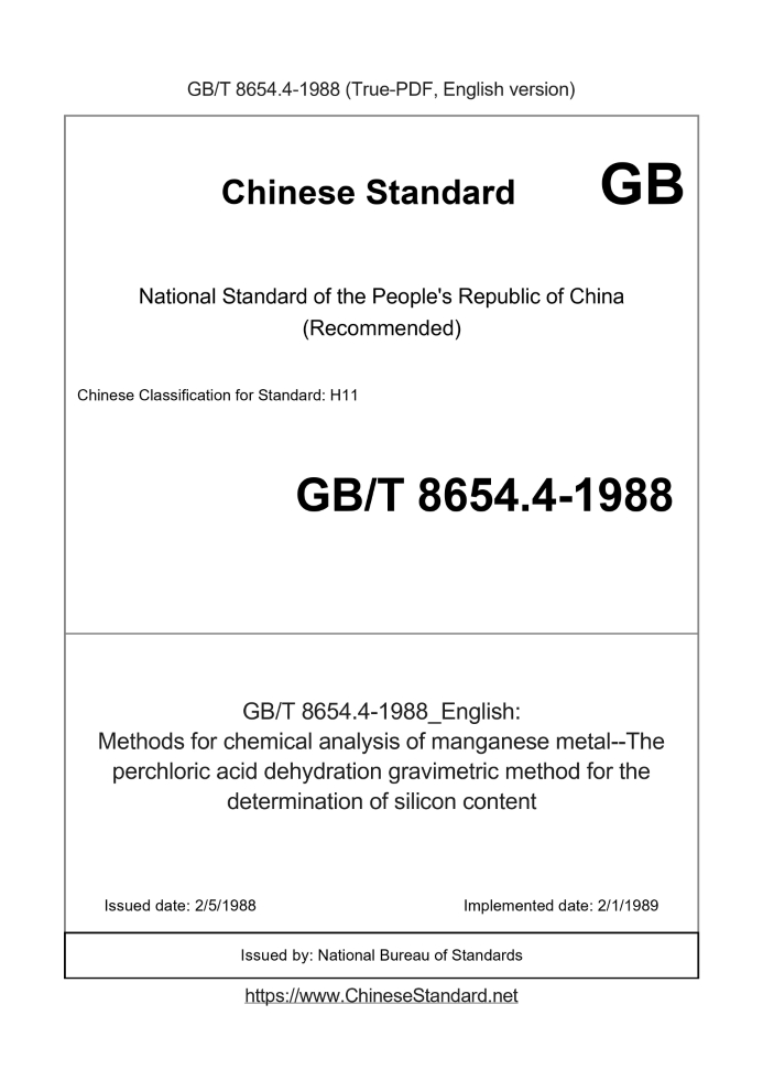 Delivery: <= 2 days. True-PDF full-copy in English will be manually translated and delivered via email. GB/T 8654.4-1988: Methods for chemical analysis of manganese metal--The perchloric acid dehydration gravimetric method for the determination of silicon content Status: Obsolete