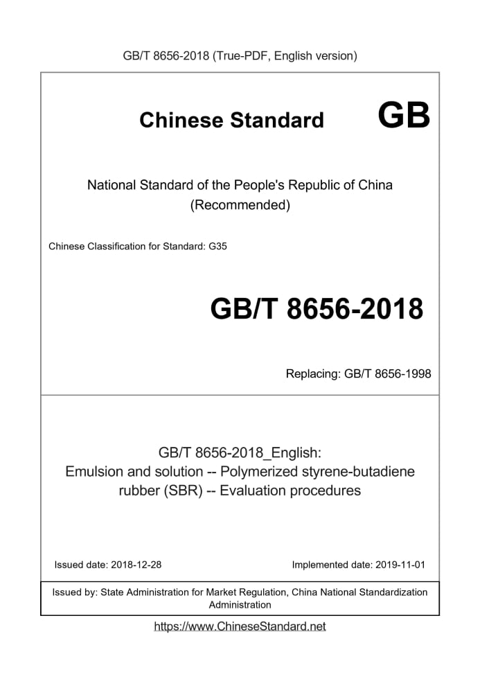 Delivery: <= 4 days. True-PDF full-copy in English will be manually translated and delivered via email. GB/T 8656-2018: Emulsion and solution -- Polymerized styrene-butadiene rubber (SBR) -- Evaluation procedures Status: Valid GB/T 8656: Historical versions