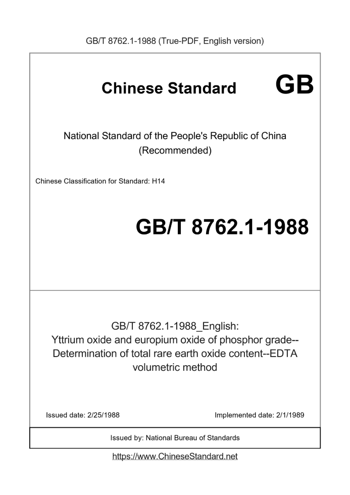 Delivery: <= 2 days. True-PDF full-copy in English will be manually translated and delivered via email. GB/T 8762.1-1988: Yttrium oxide and europium oxide of phosphor grade--Determination of total rare earth oxide content--EDTA volumetric method Status: Obsolete