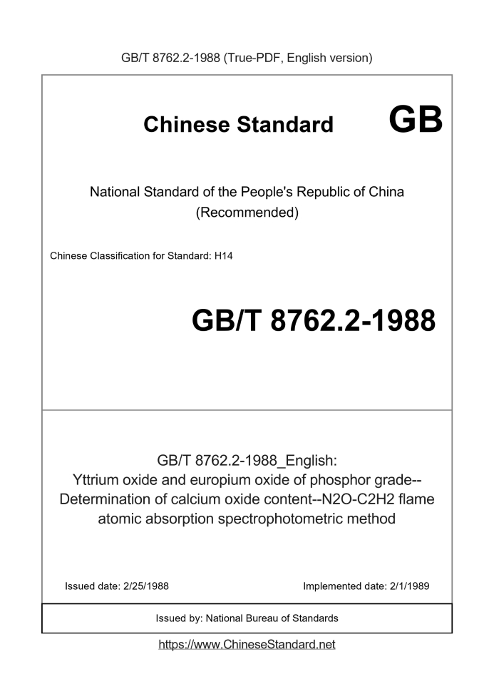 Delivery: <= 2 days. True-PDF full-copy in English will be manually translated and delivered via email. GB/T 8762.2-1988: Yttrium oxide and europium oxide of phosphor grade--Determination of calcium oxide content--N2O-C2H2 flame atomic absorption spectrophotometric method Status: Obsolete