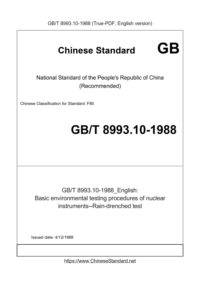 Basic dataStandard ID: GB/T 8993.10-1988 (GB/T8993.10-1988)Description (Translated English): Basic environmental testing procedures of nuclear instruments--Rain-drenched test Sector / Industry: National Standard (Recommended) Date of Issue: 4/12/1988 Tips & Frequently Asked Questions:Question 1: How long will the true-PDF of GB/T 8993.10-1988_English be delivered?Answer: Upon your order, we will start to translate GB/T 8993.10-1988_English as soon as possible, and keep you informed of the progress. The lead time is typically 1 ~ 3 working days. The lengthier the document the longer the lead time.Question 2: Can I share the purchased PDF of GB/T 8993.10-1988_English with my colleagues?Answer: Yes. The purchased PDF of GB/T 8993.10-1988_English will be deemed to be sold to your employer/organization who actually pays for it, including your colleagues and your employer's intranet.Question 3: Does the price include tax/VAT?Answer: Yes. Our tax invoice, downloaded/delivered in 9 seconds, includes all tax/VAT and complies with 100+ countries' tax regulations (tax exempted in 100+ countries) -- See Avoidance of Double Taxation Agreements (DTAs): List of DTAs signed between Singapore and 100+ countriesQuestion 4: Do you accept my currency other than USD?Answer: Yes. If you need your currency to be printed on the invoice, please write an email to Sales@ChineseStandard.net. In 2 working-hours, we will create a special link for you to pay in any currencies. Otherwise, follow the normal steps: Add to Cart -- Checkout -- Select your currency to pay. |