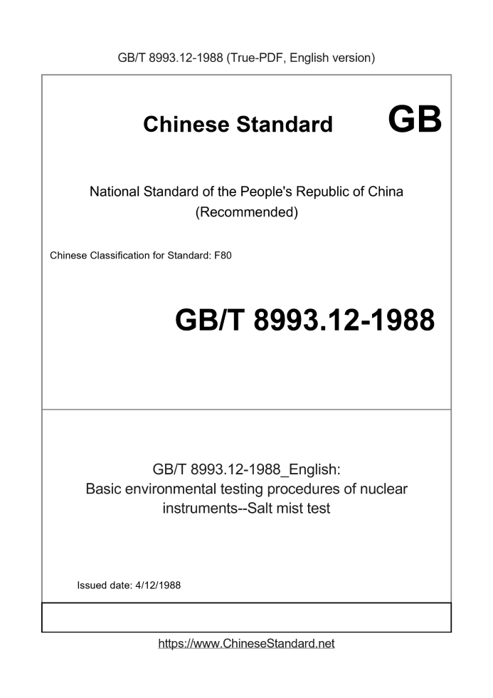 Basic dataStandard ID: GB/T 8993.12-1988 (GB/T8993.12-1988)Description (Translated English): Basic environmental testing procedures of nuclear instruments--Salt mist test Sector / Industry: National Standard (Recommended) Date of Issue: 4/12/1988 Tips & Frequently Asked Questions:Question 1: How long will the true-PDF of GB/T 8993.12-1988_English be delivered?Answer: Upon your order, we will start to translate GB/T 8993.12-1988_English as soon as possible, and keep you informed of the progress. The lead time is typically 1 ~ 3 working days. The lengthier the document the longer the lead time.Question 2: Can I share the purchased PDF of GB/T 8993.12-1988_English with my colleagues?Answer: Yes. The purchased PDF of GB/T 8993.12-1988_English will be deemed to be sold to your employer/organization who actually pays for it, including your colleagues and your employer's intranet.Question 3: Does the price include tax/VAT?Answer: Yes. Our tax invoice, downloaded/delivered in 9 seconds, includes all tax/VAT and complies with 100+ countries' tax regulations (tax exempted in 100+ countries) -- See Avoidance of Double Taxation Agreements (DTAs): List of DTAs signed between Singapore and 100+ countriesQuestion 4: Do you accept my currency other than USD?Answer: Yes. If you need your currency to be printed on the invoice, please write an email to Sales@ChineseStandard.net. In 2 working-hours, we will create a special link for you to pay in any currencies. Otherwise, follow the normal steps: Add to Cart -- Checkout -- Select your currency to pay. |