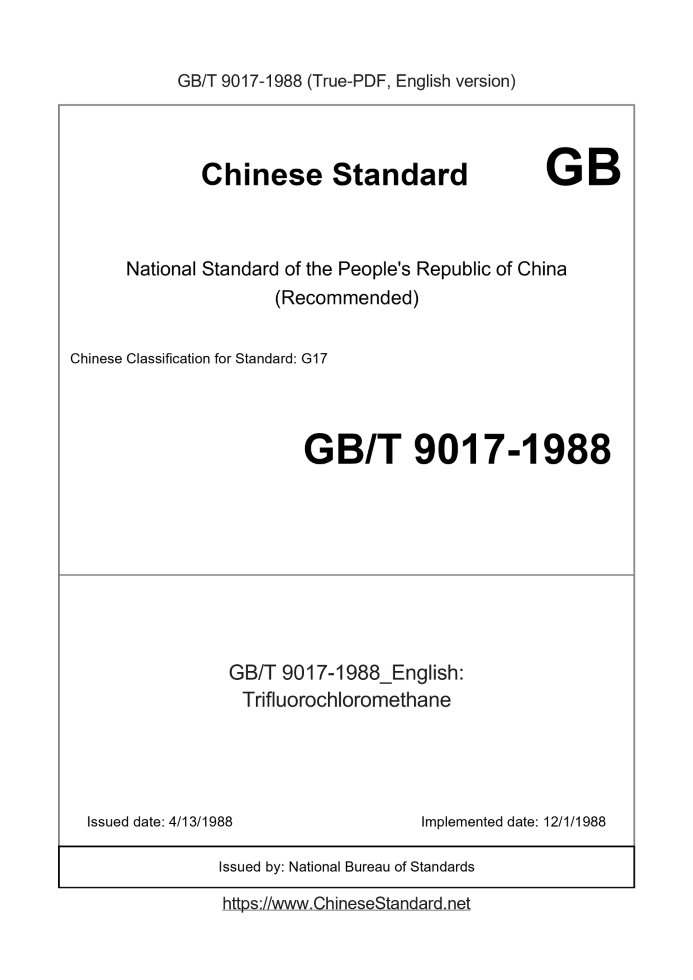 Delivery: <= 3 days. True-PDF full-copy in English will be manually translated and delivered via email. GB/T 9017-1988: Trifluorochloromethane Status: Obsolete