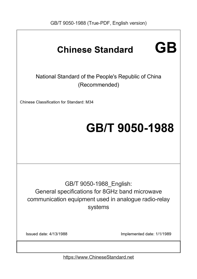 Delivery: <= 4 days. True-PDF full-copy in English will be manually translated and delivered via email. GB/T 9050-1988: General specifications for 8GHz band microwave communication equipment used in analogue radio-relay systems Status: Obsolete