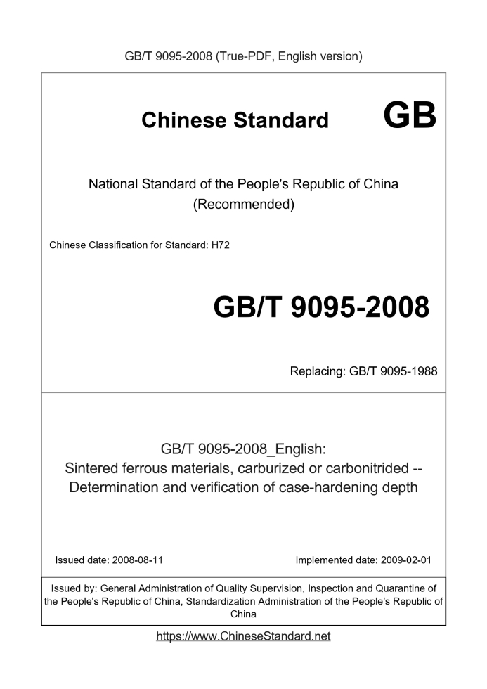 Delivery: <= 3 days. True-PDF full-copy in English will be manually translated and delivered via email. GB/T 9095-2008: Sintered ferrous materials, carburized or carbonitrided -- Determination and verification of case-hardening depth Status: Valid GB/T 9095: Historical versions