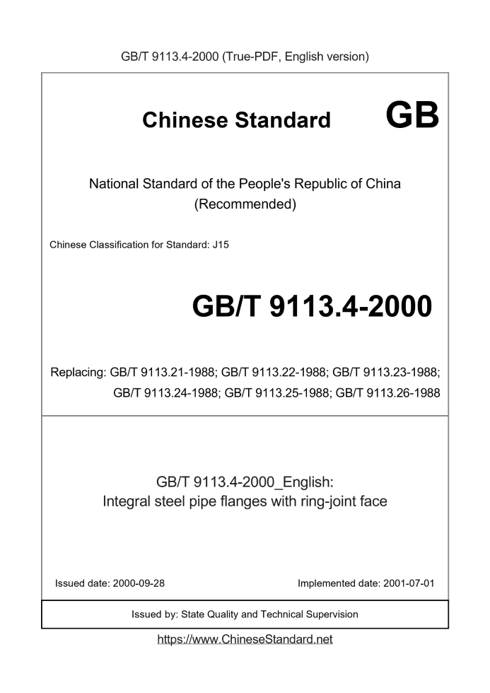 Delivery: <= 2 days. True-PDF full-copy in English will be manually translated and delivered via email. GB/T 9113.4-2000: Integral steel pipe flanges with ring-joint face Status: Obsolete GB/T 9113.4: Historical versions