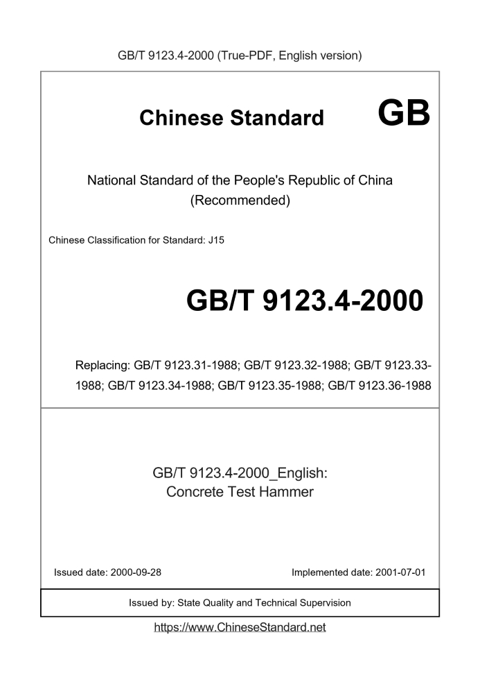 Delivery: <= 2 days. True-PDF full-copy in English will be manually translated and delivered via email. GB/T 9123.4-2000: Concrete Test Hammer Status: Obsolete GB/T 9123.4: Historical versions