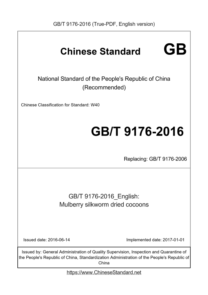 Delivery: <= 3 days. True-PDF full-copy in English will be manually translated and delivered via email. GB/T 9176-2016: Mulberry silkworm dried cocoons Status: Valid GB/T 9176: Historical versions