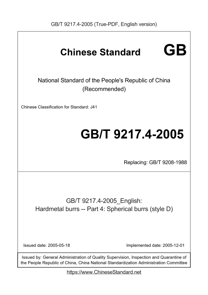 Delivery: <= 2 days. True-PDF full-copy in English will be manually translated and delivered via email. GB/T 9217.4-2005: Hardmetal burrs -- Part 4: Spherical burrs (style D) Status: Valid