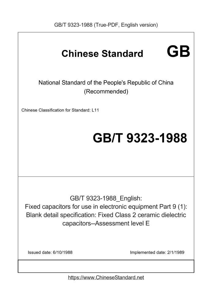 Delivery: <= 4 days. True-PDF full-copy in English will be manually translated and delivered via email. GB/T 9323-1988: Fixed capacitors for use in electronic equipment Part 9 (1): Blank detail specification: Fixed Class 2 ceramic dielectric capacitors--Assessment level E Status: Obsolete