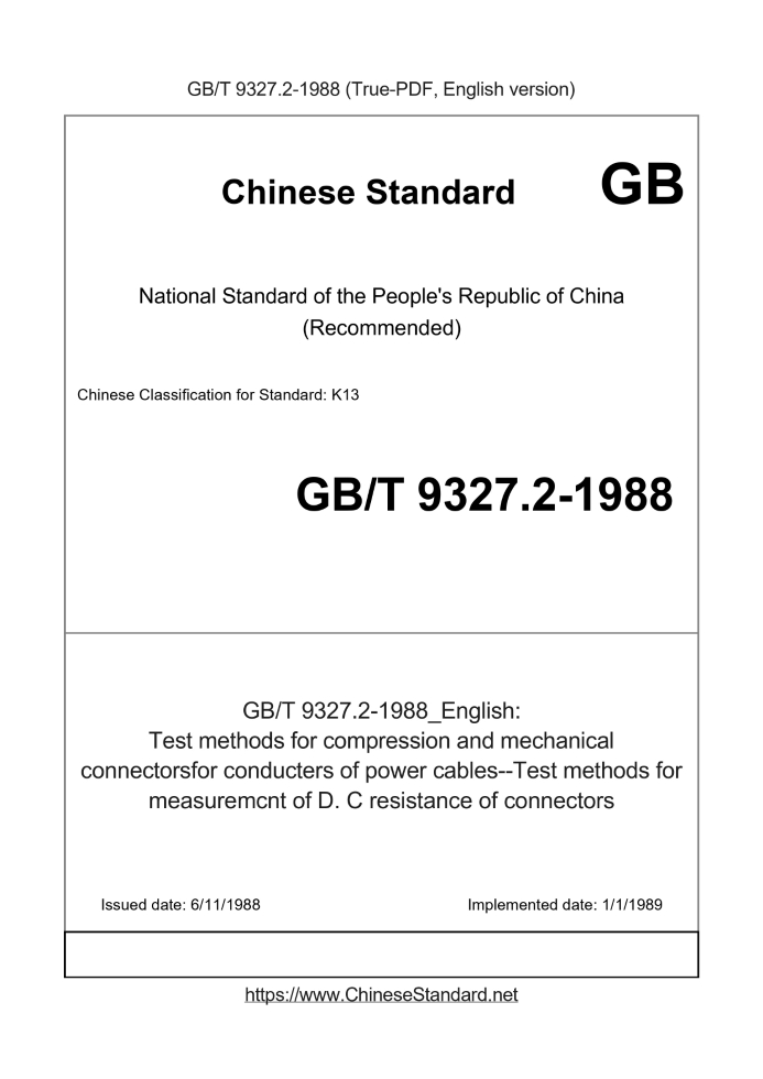 Delivery: <= 2 days. True-PDF full-copy in English will be manually translated and delivered via email. GB/T 9327.2-1988: Test methods for compression and mechanical connectorsfor conducters of power cables--Test methods for measuremcnt of D. C resistance of connectors Status: Obsolete